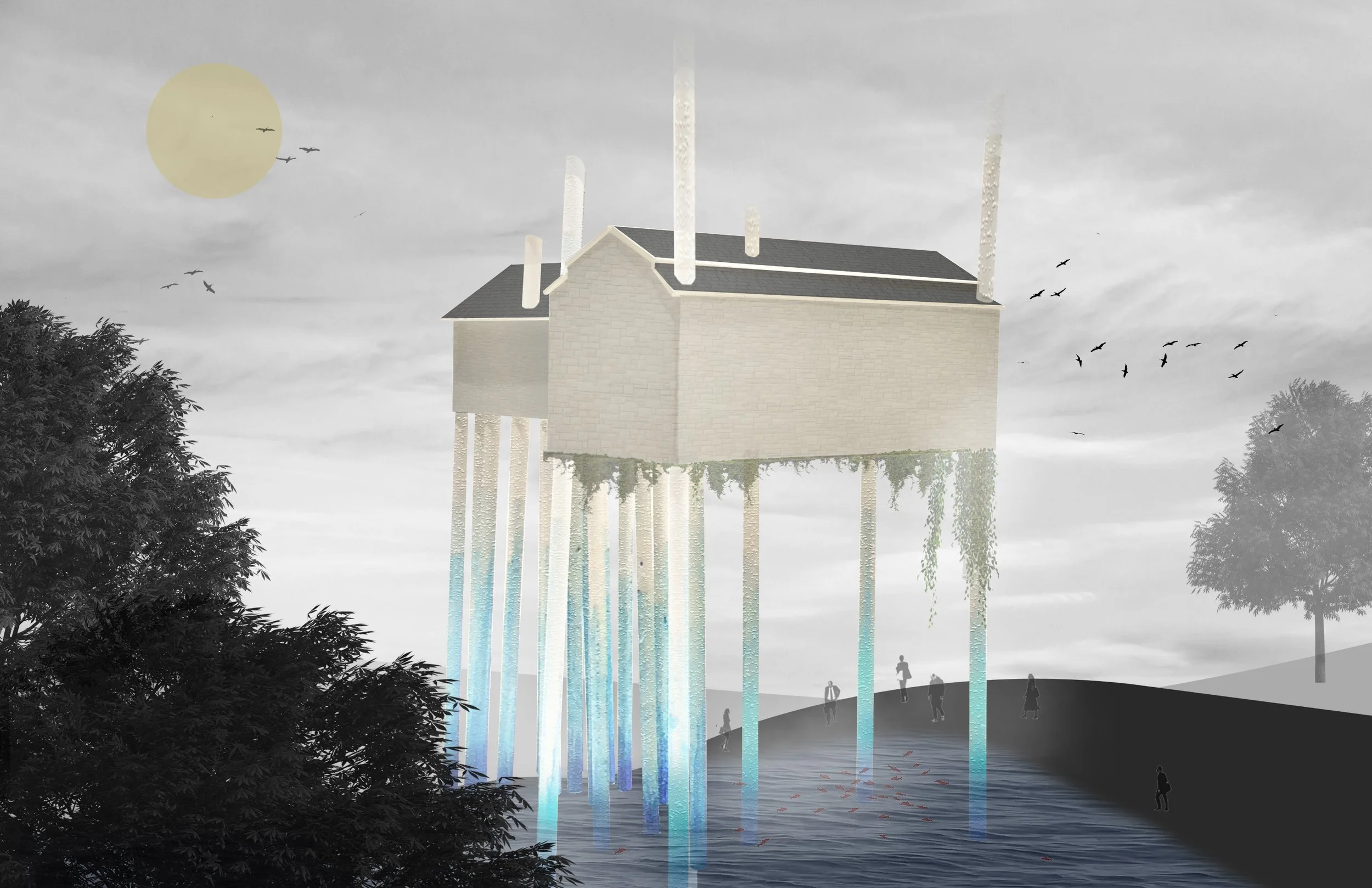 Reimagining a flood-prone mill as an eco-crematorium, the design establishes "soft infrastructure" that embraces rather than resists water. The architecture choreographs a coexistence between ecological adaptation and the collective ritual of mourning.